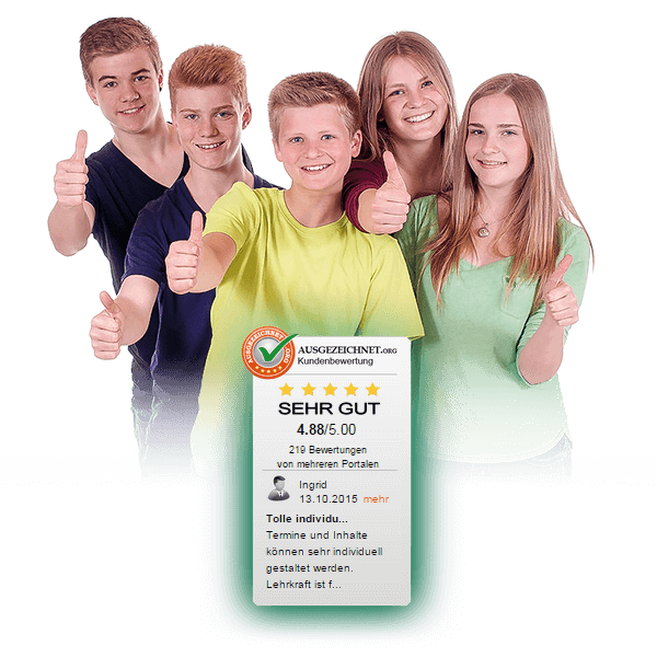 Unsere Nachhilfe-LernerfolgeGute Noten – wir freuen uns darauf Die Beseitigung von Lerndefiziten und die Verbesserung der Lernkompetenz stehen bei der Einzelnachhilfe im Vordergrund. Durch Erfolgserlebnisse in Form von guten Noten bei Abfragen, Tests und Klassenarbeiten verliert Ihr Kind die Hemmungen vor den Problemfächern und gibt ihm die Freude am Lernen zurück. Wundern Sie sich also nicht, wenn das Problemfach Ihres Kindes plötzlich zu dessen Lieblingsfach wird. Ständig erhalten wir von unseren Kunden sehr positive Resonanzen und auch wir sind immer wieder sehr erfreut, welche Notenverbesserungen sich bereits nach wenigen Wochen Einzelnachhilfe einstellen. Lesen Sie selbst… Manuela und Rainer Nützel, ElternWir haben gesehen, dass unser Kind die Schule schaffen kann, wenn ihm jemand ein bisschen hilft. Wir selbst konnten dies nicht leisten. Mit dem Studentenring haben wir professionelle Einzelnachhilfe gefunden. Dank der jungen Nachhilfelehrerin hat unser Kind nicht nur seine schulischen Ziele erreicht, sondern auch noch Freude dabei gehabt. Christian Müller, AbiturientMein Wunsch ist es, Arzt zu werden. Deshalb brauche ich ein gutes Abi. Meine Defizite lagen besonders in Deutsch und Englisch. Also entschied ich mich für die Nachhilfe vom Studentenring. Der Nachhilfelehrer war einige Jahre älter als ich und so verstanden wir uns recht gut. Er verbesserte mein Verständnis für Sprachen und schloss meine Lücken in Englisch. Dank seiner tollen Betreuung kann ich jetzt gewiss den numerus clausus knacken. Martina Korte, SchülerinIrgendwann habe ich den Durchblick verloren. Meine Freizeit mit mehr Lernen zu verbringen, wollte ich zuerst auch nicht. Aber die Nachhilfelehrerin vom Studentenring war einfach klasse. Sie konnte mir die Sachen verständlich erklären. Und sie hat mir mit ein paar wenigen Übungen geholfen, in der Schule wieder mitzukommen. Elfriede Ecker, LehrerinManche Schüler brauchen zusätzliche Lern- oder Hausaufgabenhilfe und können anschließend erfolgreich in der Schule sein. Mit dem Nachhilfekonzept des Studentenrings werden die Schüler in einer entspannten, gewohnten Atmosphäre wieder an das Leistungsniveau der Klasse herangeführt. Total zufrieden Der Studentenring macht hervorragende Arbeit! Meine Tochter konnte sich in wenigen Wochen stark verbessern! Von einem Wackelkandidaten ist sie zu einer guten Schülerin mit Eigeninitiative heran gereift! Die Lehrkräfte sind sehr zuverlässig und gewissenhaft und passten auch von der Wellenlänge her von Anfang an zu meiner Tochter! Ich kann den Studentenring nur weiter empfehlen! Top Leistung zu fairen Preisen und Konditionen! Hier nachlesen Andrea Das meinen unsere Kunden: Nachhilfebereich Englisch Wir als Eltern sind froh, den Studentenring kontaktiert zu haben. Dank der liebenswerten Nachhilfe konnte sich unsere Tochter in Englisch um zwei Noten verbessern. Zudem bleibt uns viel Zeit erspart, da wir keine unnötigen Fahrzeiten haben. Wir werden auch weiterhin die Hilfe in Anspruch nehmen, um unsere Tochter auf Ihren Englischabschluss vorzubereiten.Hier nachlesen Schuster Absolut empfehlenswert Super nette Nachhilfe.Kompetent,verlässlich,kurzfristige und unkomplizierte Terminabsprachen,hervorragende Ergebnisse. Jederzeit wieder und uneingeschränkte Weiterempfehlung. Hier nachlesen K.B. Erfolgreiche Nachhilfe für Matheleistungskurs Begleitend zum Mathematikleistungskurs (Jahrgang 12) wollte unserer Sohn sich im Hinblick auf die Abiturklausuren unterstützen lassen. Durch die geleistete Nachhilfe gewann er extrem an Sicherheit und ging entspannt in die Klausuren, das Ergebnis übertraf alle Erwartungen. An dieser Stelle noch einmal herzlichen Dank an Justus. Hier nachlesen Mutter eines ehemaligen Abiturienten Vielen Dank Danke , an das gesamte Team vom Studentenring, für die superschnelle Vermittlung einer Deutschnachhilfe für unsere Tochter, 10.Kl.,Gymnasium und für die schnellen und immer sehr freundlichen Infos am Telefon. Unsere Tochter hat schnell einen sehr guten Draht zu ihrer Studentin gefunden und sie kann ihr den geforderten Lernstoff super vermitteln, so dass die letzte Schulaufgabe sehr entspannt und ohne Angst abgelaufen ist. Wir können den Studentenring wirklich nur weiterempfehlen.Hier nachlesen Barbara S. Wir (Schüler und auch wir Eltern) sind begeistert! Unser Sohn hat stolz seine erste 3 in einer Französisch- Schulaufgabe nach Hause gebracht! Und freute sich riesig und wir Eltern uns mit ihm. „Diese Nachhlife bringt was!“ Was gibt es besseres aus dem Mund eines 14-jährigen? Es liegt auch sicher daran, dass er mit der Französisch-Nachhilfestudentin gut auskommt und umgekehrt…Hier nachlesen Sehr gute Mathenachhilfe Flexibel, individuell und effizient. Für meine Tochter ist es genau das richtige. Die Studentin hat sofort einen Draht zu ihr gefunden und sie hat dich um 2 Noten verbessert. Hier nachlesen Svenja Sehr zufrieden mit Qualität des Lehrpersonals und auch mit der Organisation Mein Sohn hat seit einem Jahr Englisch-Nachhilfe beim Studentenring und bereitet sich nun aufs Abitur vor. Die Lehrkraft letztes Jahr war sehr engagiert und motiviert. Ebenfalls war die Zeiteinteilung sehr flexibel. Als sie in den Ferien längere Zeit nicht da war, hat der Studentenring für adäquaten Ersatz gesorgt. Mit der nun neuen Lehrkraft hat mein Sohn erst 2 Stunden gehabt, so dass eine Beurteilung noch nicht möglich ist, aber auch hier lief der Wechsel organisatorisch vorbildlich ab. Wir mussten uns um nichts kümmern,…Hier nachlesen Anja Um zwei Notenstufen verbessert Mein Kind hat sich dank der Unterstützung um zwei Notenstufen verbessert. Als die Nachhilfe mehrere Wochen im Ausland war, wurde sich von selbst um eine Vertretung gekümmert. Zeitlich sehr flexibel. Toll Hier nachlesen Tanja Sehr hilfreich Meine Tochter hat die Angst vor Mathe verloren.Zu Hause in entspannter Atmosphäre lernen. Läuft alles unkompliziert und ganz flexibel. Hier weiterlesen Claudia Latein Nachhilfe